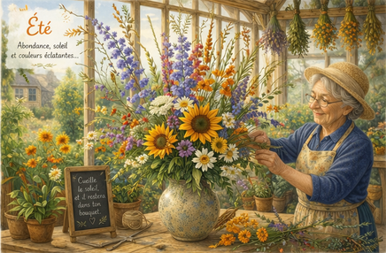 Mamie Jeanne compose des bouquets lumineux, remplis de chaleur et de vie, où chaque fleur semble raconter une journée de soleil.